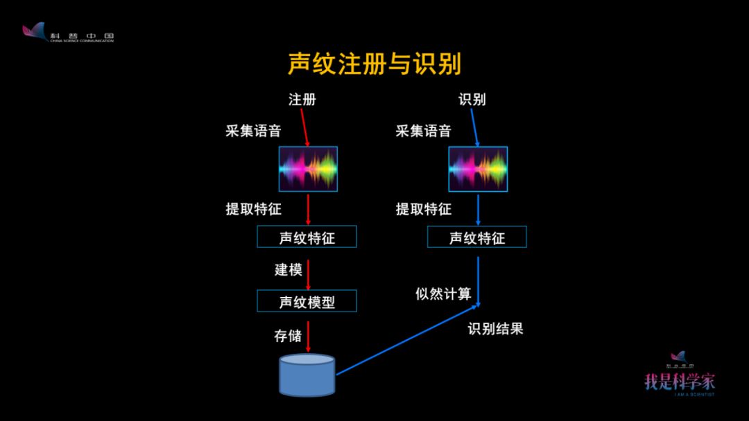 识别前,计算机要先去了解声纹,这个过程叫做注册。一般来说,就是要采集用户的一段语音,然后提取其中的声纹特征,建立声纹模型,存储在数据库里。认证或识别的时候,同样需要采集一段语音(一般会比注册短很多),从这段语音里也去抽取声纹特征,然后从数据库里拿出声纹模型进行某种计算,最后得到识别结果。
