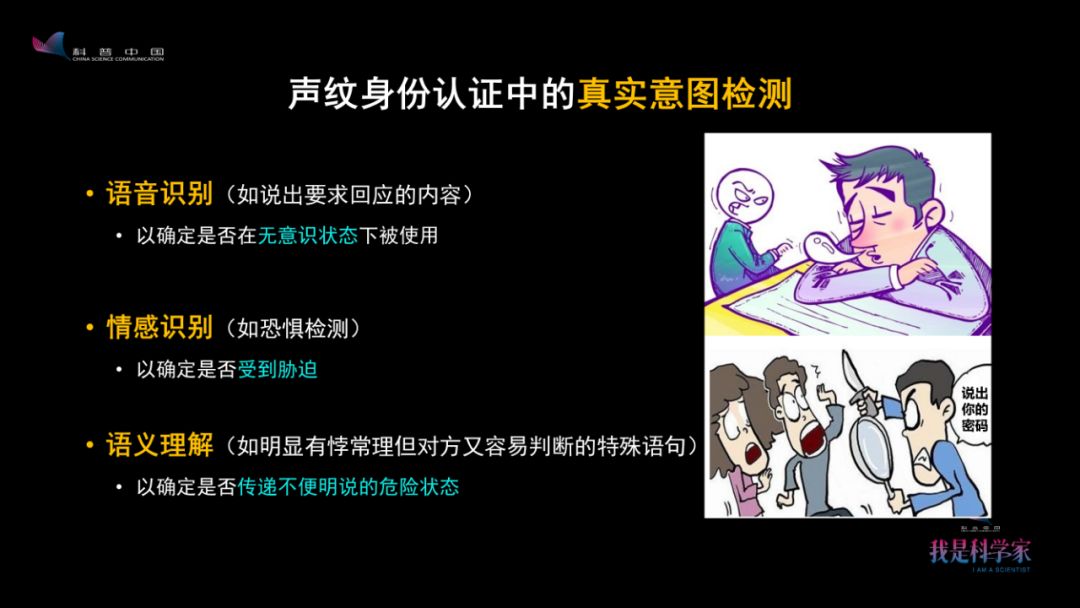 关于声纹身份认证的安全性,我们有非常多的考虑,比如是否出自本人的意愿。我们设计的方案里需要用户去读一串随机生成的文本,或者回答问题,就能保证用户不是处于非清醒的状态。