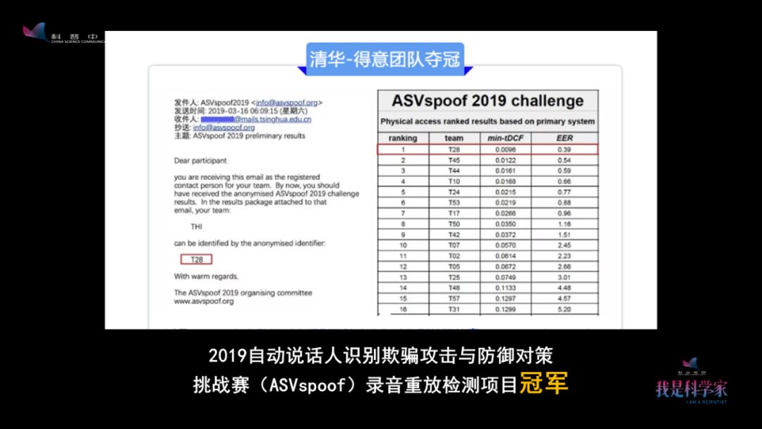 我们近几年研究的一个重要课题就是录音重放。我们参加了2019年国际自动说话人验证欺骗和对策挑战赛,其中就有录音重放的检测项目。在全世界156支队伍里头,我们清华-得意团队以挺大的优势拿到了第一名,等错误率只有0.39%(每一千个语音里有四个识别错误)。