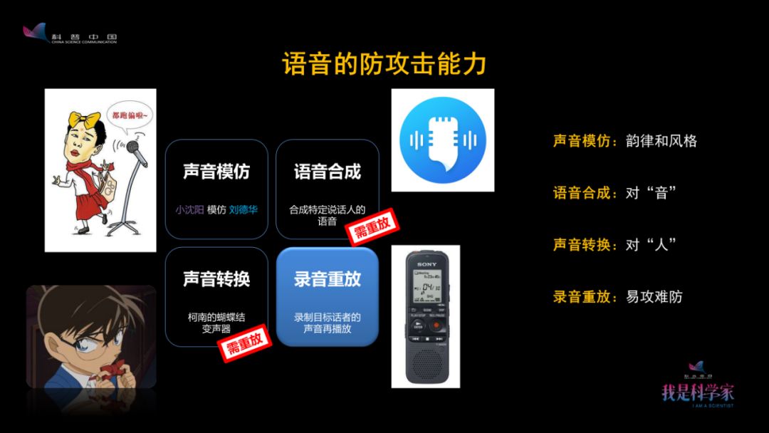 实际上,所谓的模仿秀一般是模仿人说话韵律和风格,没有办法去模仿生理结构。所以不管是研究还是应用,从来没有发生过声音模仿闯入系统的情形。至于计算机合成,目前的合成技术有一定针对性,往往是针对语音中一两种信息做的合成,能够检测出来。另外,不管用了计算机的什么技术,来源肯定是已经录制的数据,还要通过扬声器播放,其实就跟录音再播放有相同的过程,我们把这种现象称为录音重放。