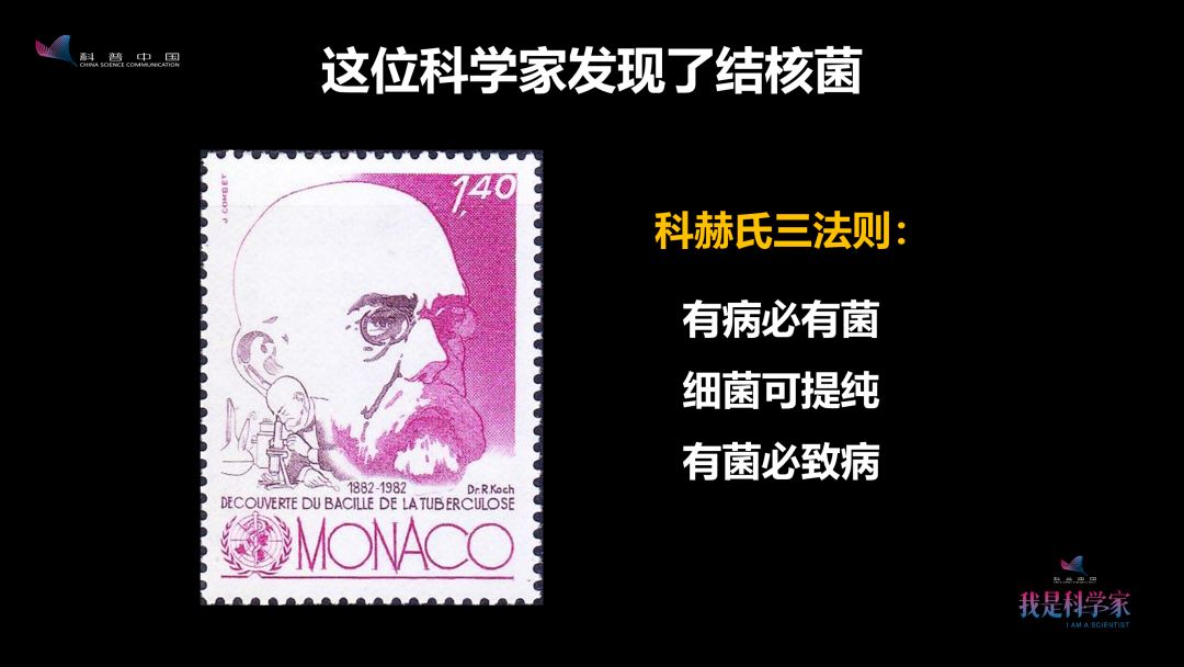 1882年,德国科学家科赫(Robert Koch)提出了一个理论,他认为所有的传染病一定有致病细菌,有细菌就一定可以通过科学方法培养,而且打到动物体内就一定可以让动物得相同的疾病。他用这种办法发现了结核菌,并获得了当年的诺贝尔奖。