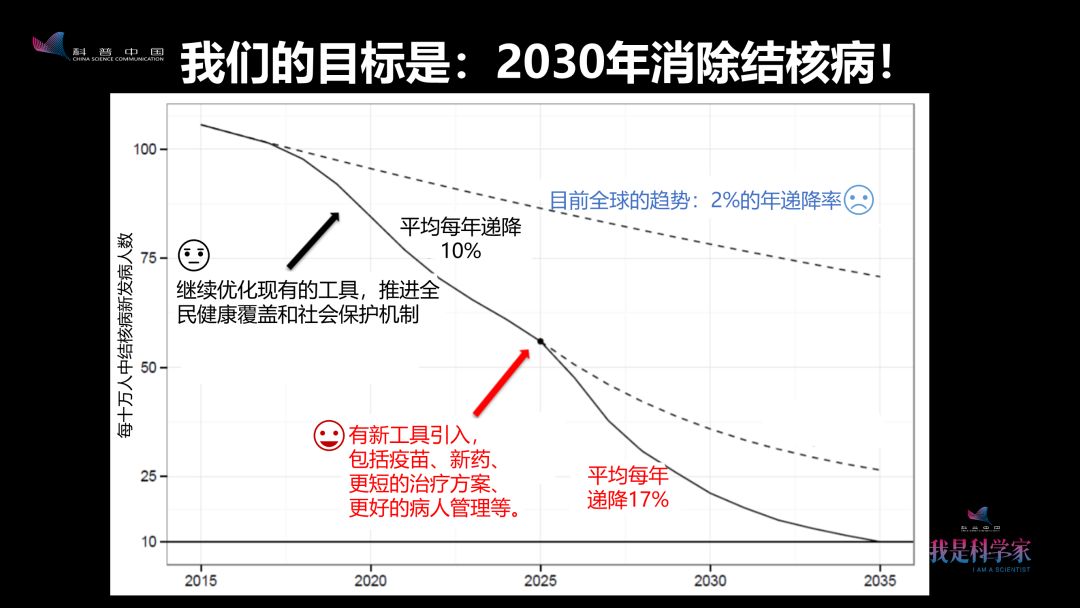 最上面的虚线,代表着现在全球结核病的年递降率只有2%,按照这个趋势,我们可能要100年才能消除结核病。第二条线,代表着中国用新的模型将现有工具用到最好,可以达到接近10%的递降率,但也不能完成2030年的消除目标。如果想在那个时候完成,我们必须要达到17%的递降率,就需要新的工具引入,包括保证不发病的疫苗,2个月就能治好结核病的方案,更好的保护措施等等。