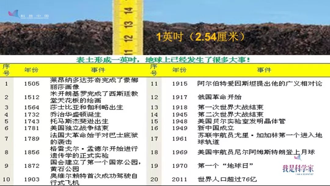 土壤形成非常慢,形成1英寸至少要500年。也就是说,从达·芬奇画《蒙娜丽莎》第一笔开始,到现在只长出1英寸表土。但与此同时,地球上已经发生非常多故事了。