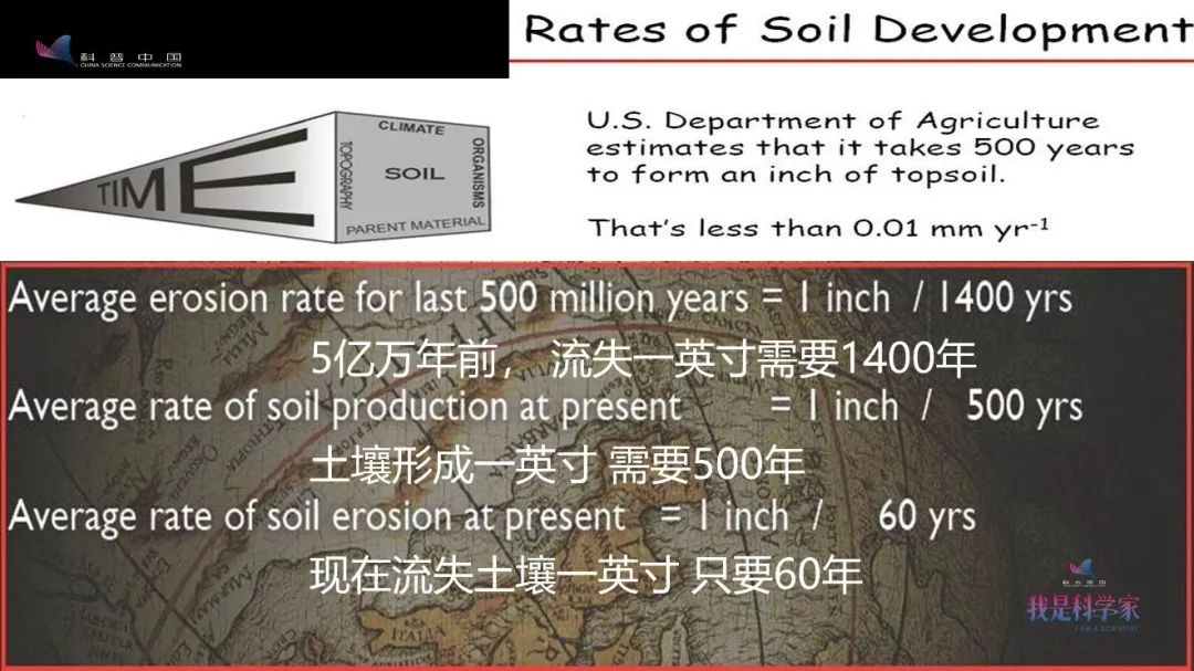 5亿万年前,流失1英寸需要1400年,形成1英寸需要500年,所以古代土壤是越积越多,越积越厚,为今天文明立下了坚实基础。但是现在,流失1英寸土壤只要60年。