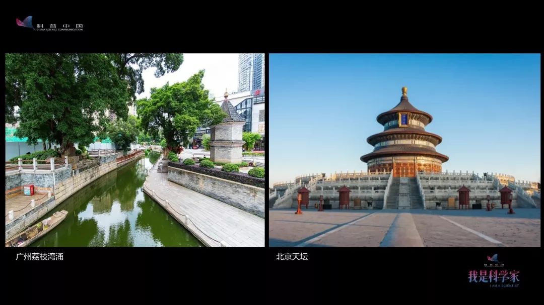 左边这幅图是荔湾区荔枝湾村,曾经环境污染非常严重,但2008年亚运会后进行了大规模改造,现在自然环境也很好,文化底蕴也显现出来了,成为了广州非常热门、也很有意思的旅游景点。你如果想去看看真正的老广州,就可以去这里。右边这幅图是北京天坛,也是非常好的一个景点。