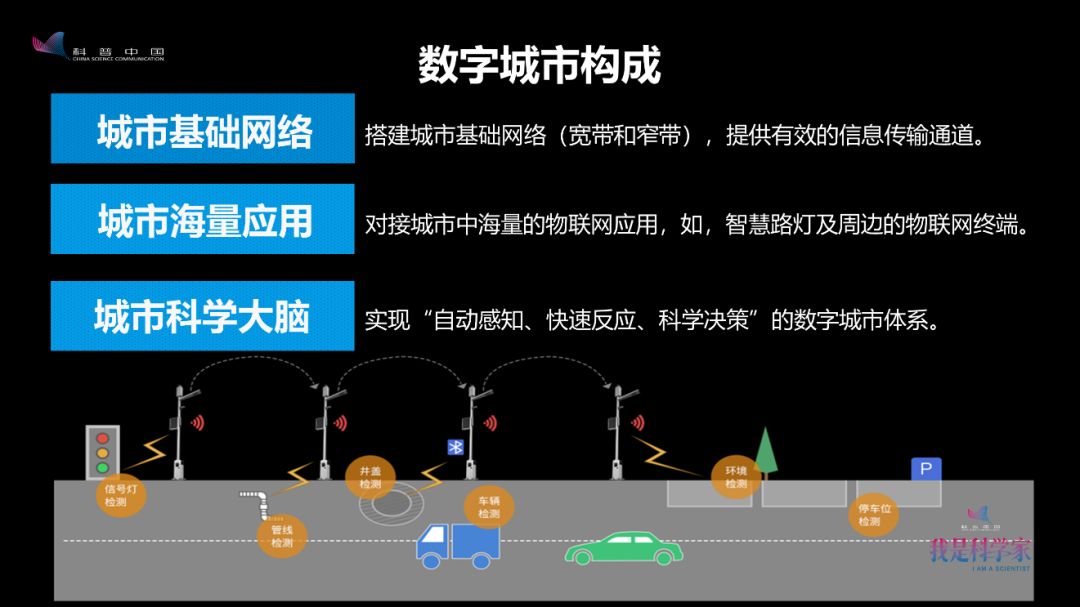 数字城市由城市基础网络、城市海量应用以及城市科学大脑三部分组成。其中,城市基础网络对接了城市的海量应用,然后将信息传输给城市科学大脑;城市科学大脑对收集到的信息进行判断、决策,最终完成整个智慧城市的运营。所以,城市基础网络是整个数字城市的信息通道,有了信息通道才形成了网络。
