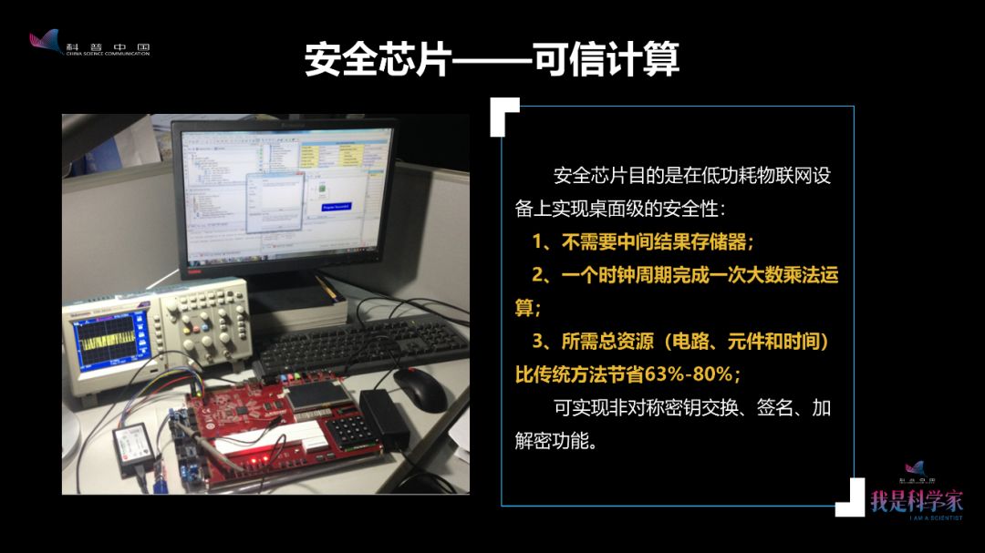 我们不仅在算法协议上进行了研究,还利用可信计算的方式进行了安全芯片的研发。大多数物联网终端设备都是低功耗的设备,不支持高功率的安全算法芯片以及安全算法。这样一来,我们如果想保证物联网终端设备的安全,就要给它一个轻量级的安全算法和更有效的安全协议。