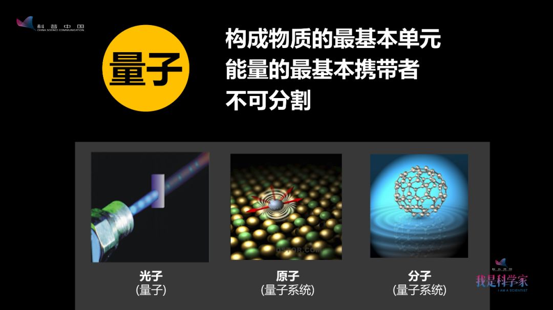 简单地介绍一下,量子到底是什么呢?原子其实就是一个量子体系,还包括分子,包括光子,我此刻用的激光笔,每秒钟大概就有10^18个光量子打到屏幕上。