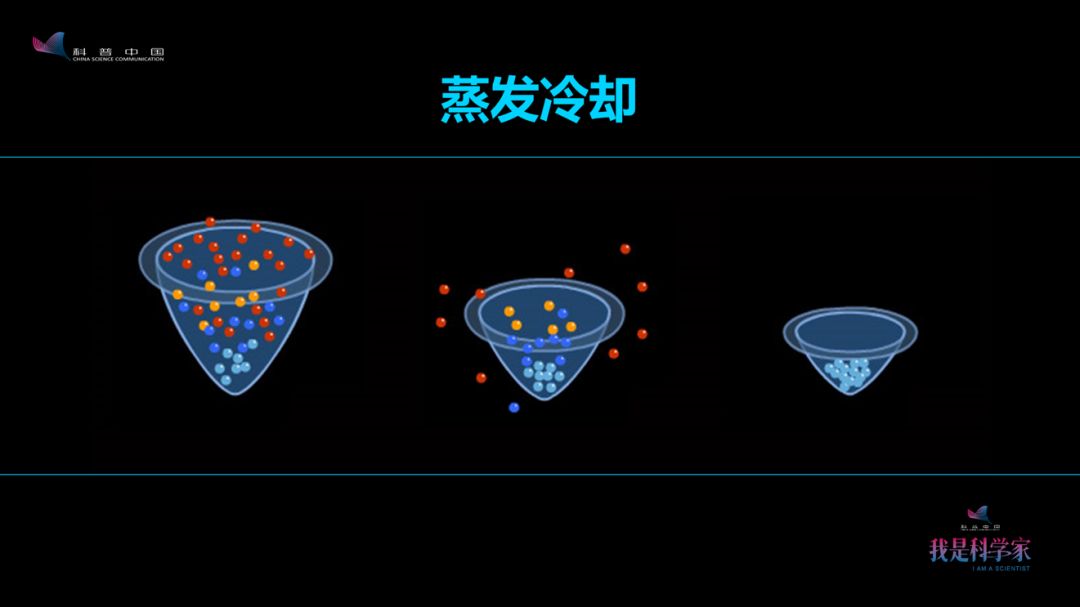 进一步冷却需要一个“蒸发冷却”的过程。就像我们喝咖啡,咖啡很烫,我们吹一吹,水蒸发掉之后就能冷下来。原子也一样,让热原子跑掉,剩下的原子进行热平衡,就冷下来了。