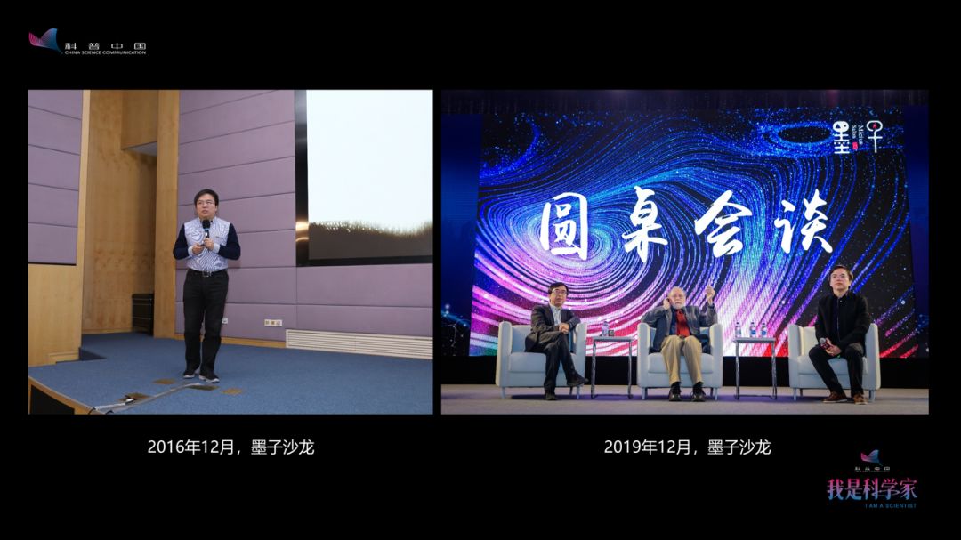 左图是我2016年参加墨子沙龙做报告的照片,右图是我2019年主持墨子沙龙圆桌会谈的照片。大家可以看到墨子沙龙的会场越来越好看了,我也越来越好看。