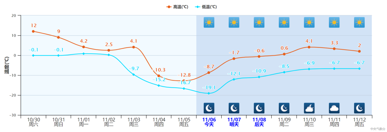 冷气团的入境路线自我国新疆北部开始。在寒流的淫威下,超级计算机就曾预测北疆的富蕴地区将迎来一日骤降30度的极端景象,11月4日最低温度可能探底至零下30摄氏度。而实际情况亦所差无多,11月4日至11月6日期间,温度逐步下探至零下20摄氏度。