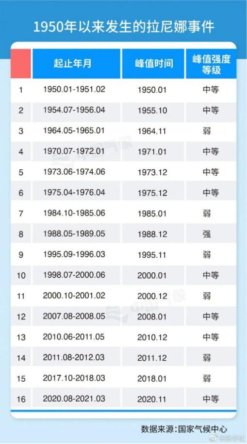 1950年以来发生的拉尼娜事件和平均气温