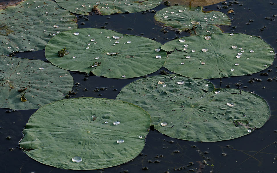 仔细观察就会发现,落在荷叶上的水滴不仅总是会保持球形,而且当微风吹过,叶片略有倾斜时,水滴很快就会滚落。相反,落在玻璃上的水滴不仅会铺展开,而且只有大幅度倾斜玻璃时,水滴才会流下。