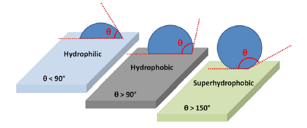 水在亲水、疏水和超疏水表面上的接触角的比较。