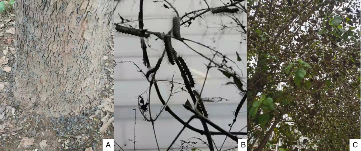 美国白蛾危害A)地面爬行;B)枝叶受害;C)枝叶受害
