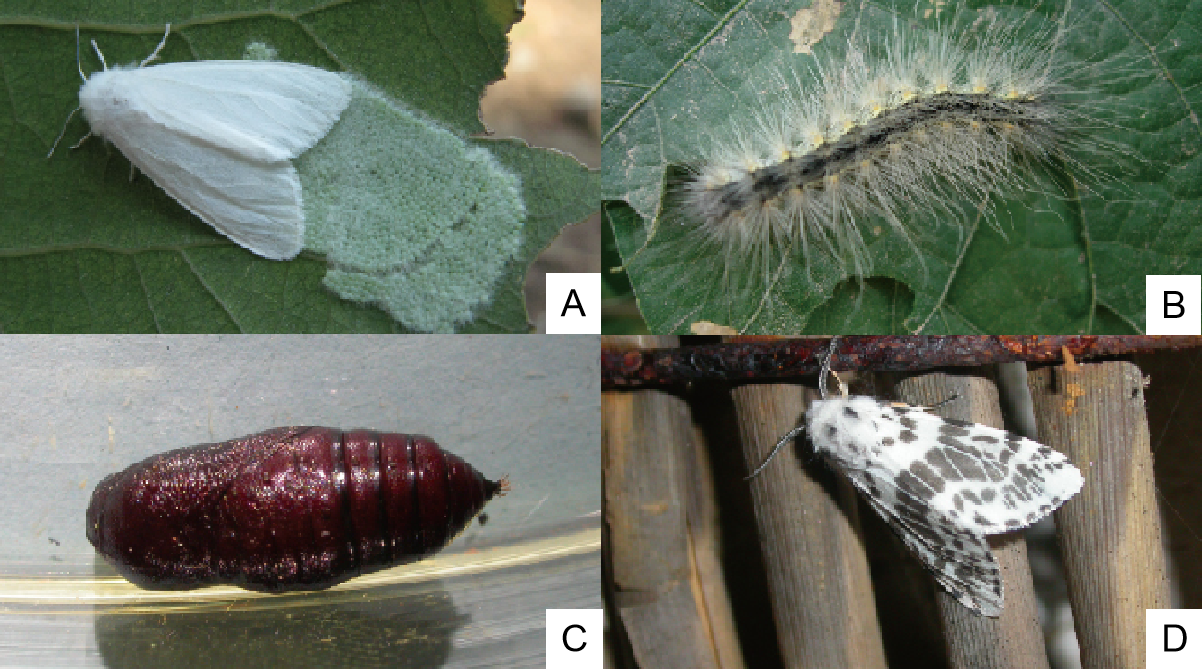 美国白蛾不同虫态A)卵;B)幼虫;C)蛹;D)成虫