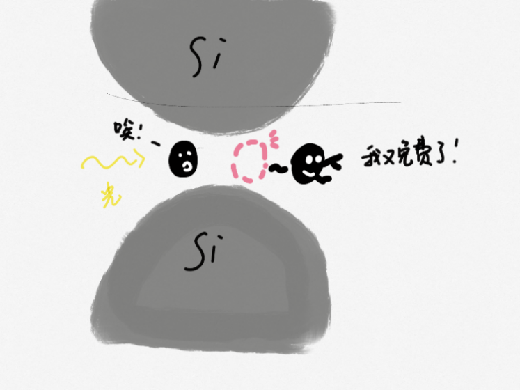 把太阳光打到PN结上,会发生什么呢?没错,是光伏效应。光伏效应的作用就是让那些已经成对的价带电子再次受到“诱惑”,并再次形成电子空穴对。实质就是我们前面讲的价带电子吸收了光的能量,能量变高,跃迁到了导带上。