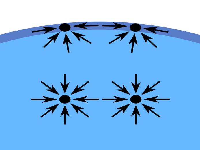 液体内部分子A与周围分子的作用力是对称的,相互抵消,合力为零,因此A在液体内部移动时不需要做功。而对于表面分子B,与表面下的水分子相互的作用力强烈,与表面上的空气作用力则较弱。由于上下的作用力大小不一致,因此B处于一个不对称的力场中,形成了一股指向内部的合力,此力力图将其拉回液体的内部。