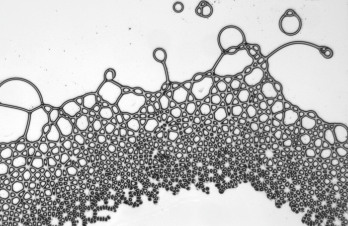 而基于此项研究的另一项潜在的成果,是能够构造相互作用的滚动细丝和微液滴。这对微生物基于各不相同的机制推进的动力学特性和集群行为也能进行指导研究。