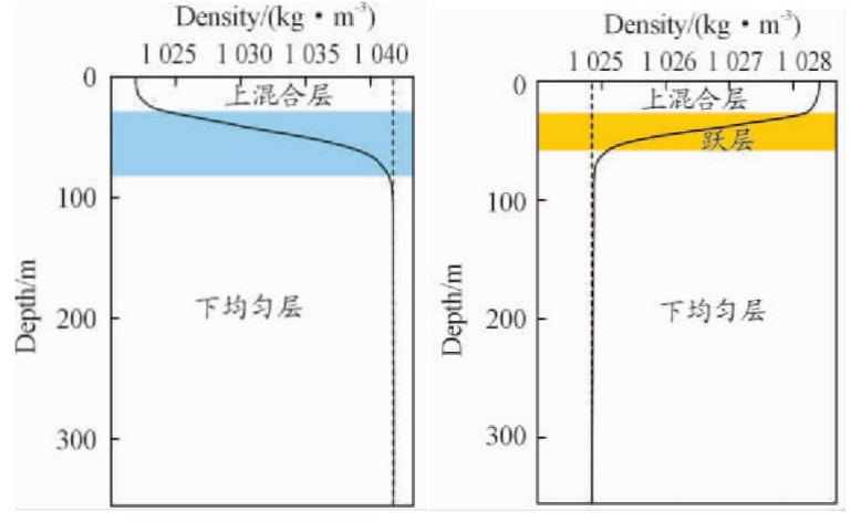 由于不同区域海水盐分、温度等不同,海水的密度随着深度的增加并不总是呈现均匀分布状态。当海水的密度随深度的增加突然改变时,就会在垂直方向上产生密度跃层。当跃层上部海水密度小于下部海水密度时,海水浮力由上至下急剧加大,上下层之间就会形成一个屏障,潜艇就会有触碰海底的感觉。