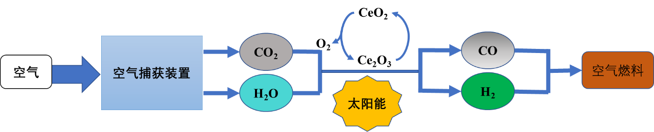 直接转化比较困难,一种权宜之计就是先把它们制备成合成气,即氢气和一氧化碳,这是制备许多化工原料的原料气。这套实验装置采用的方法是利用太阳能,驱动二氧化碳和水蒸气与三氧化二铈发生氧化还原反应,二氧化碳和水分别被还原为一氧化碳和氢气,而三氧化二铈被氧化为二氧化铈。氧化产物二氧化铈还可以通过吸热热还原为氧气和三氧化二铈,便于再次循环利用。合成气一氧化碳和氢气接下来会进入反应设备生成目的产物液态烃或甲醇,也就是空气燃料。