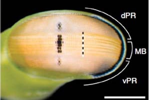 螳螂虾的眼睛,dPR(dorsal Peripheral Region)是背部外围区,vPR(ventral Peripheral Region)是腹部外围区,二者大致对称;MB(Mid-Band region)是中间带状区