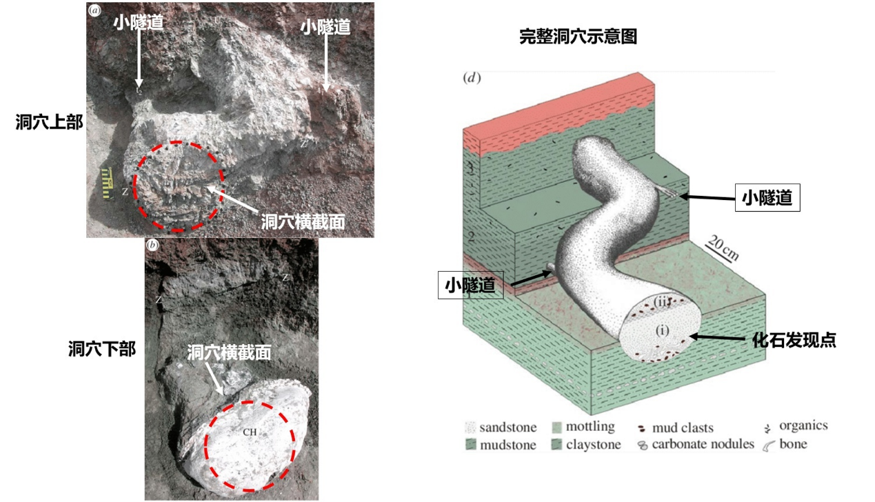 蒙大拿州的掘奔龙洞穴照片与示意图,三只掘奔龙的化石在洞穴最深处(图片来源:修改自参考文献2)