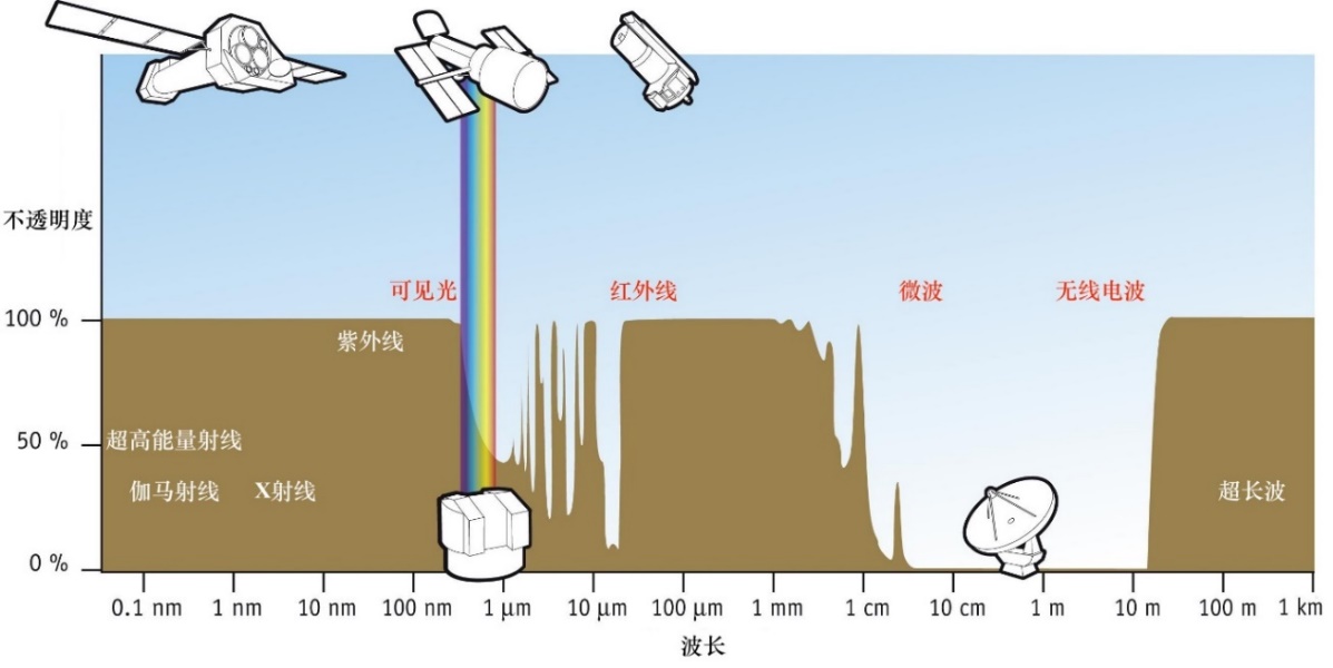 从地球表面观测电磁波的频谱窗口透明度,真正的有效观测的窗口极小