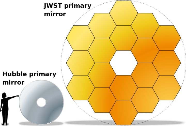 人类、哈勃望远镜主镜和詹姆斯·韦伯主镜的大小对比