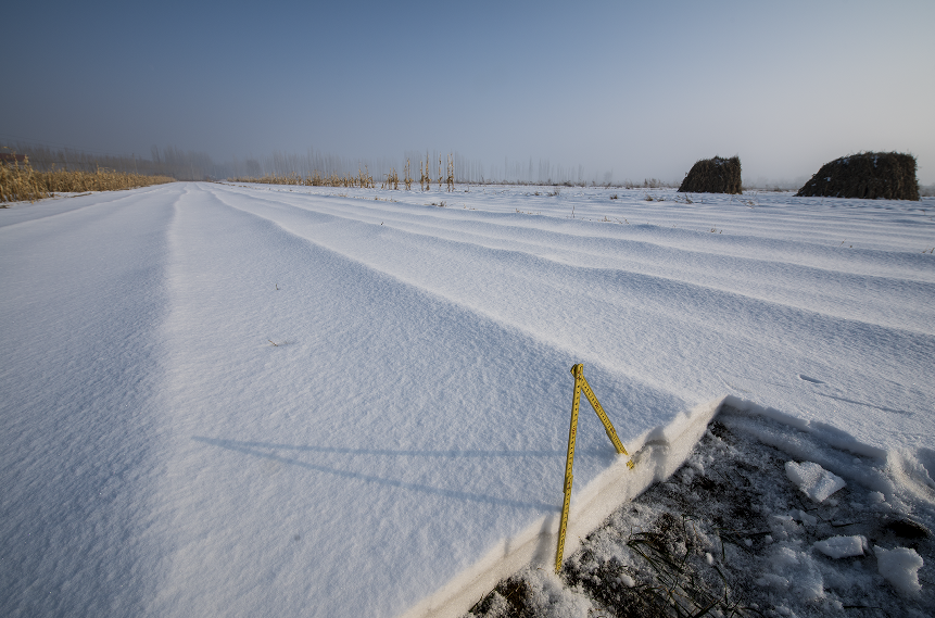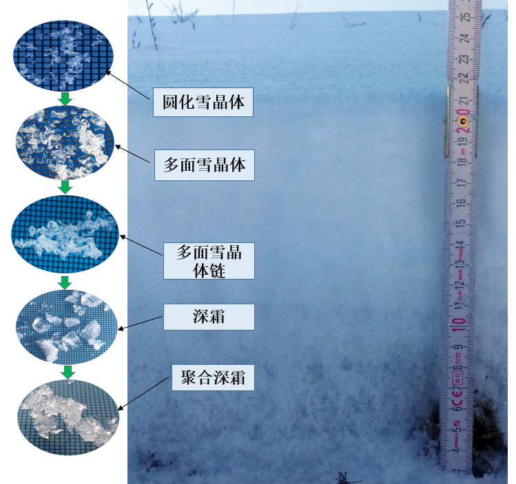 由于雪粒沉降时间不同,雪晶体的发育程度不同,雪晶体的颗粒和大小也就形成了明显的差异。因此雪剖面轮廓呈现明显的层理结构,从上到下为圆化雪晶体、多面雪晶体、深霜。
