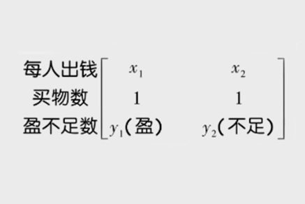 这个矩阵的表述就是,如果只买一件的话,每人出x1元,还盈余y1元;每人出x2元,则还差y2元。