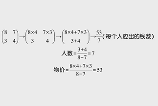这个题如果放到现在来说,我们可以应用方程组求解,假设共有x个人,物品的价格为y元,则8x-y=3、y-7x=4,因此我们非常容易就能得到答案:x=7, y=53。