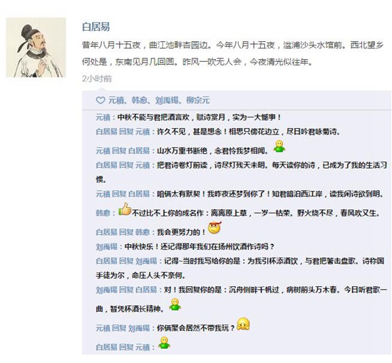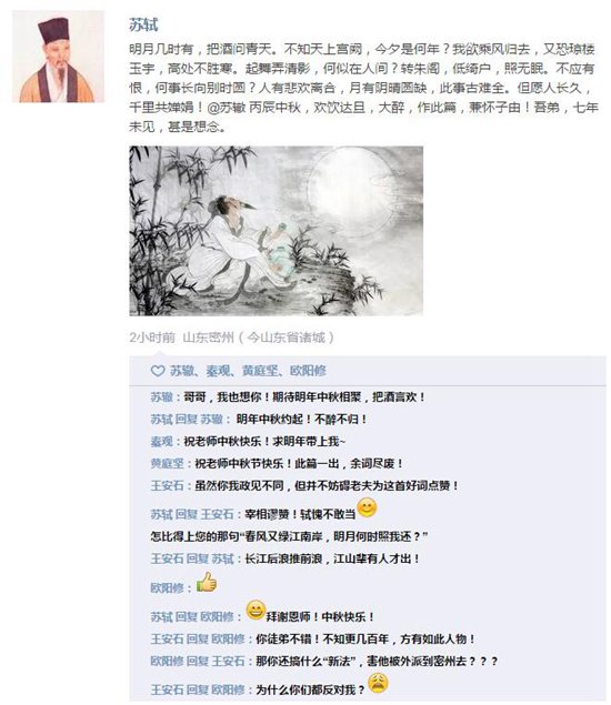 【文艺星青年按】如果当年唐宋时期的大文豪们都玩朋友圈,那一定充满诗意,而且随随便便抛出一句话都是狂刷屏的节奏。只是没想到,中秋节这天,他们的朋友圈突然状况百出:寂寞的李白呼朋唤友,落单的苏轼大醉一场,才女李清照则和丈夫秀起了恩爱……到底发生了什么事儿?快跟小编一起去看看吧。