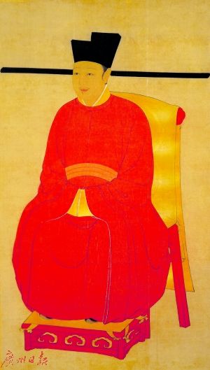 如果《明太祖坐像》想要塑造的是一位英挺焕发、雄赳赳气昂昂的开国帝王,那么另一幅《明宣宗坐像》,所呈现的便是明朝迈向文治之后,气度弘阔的君王形象。明宣宗朱瞻基在位10年(1426~1435),年号宣德。由于他雅好丹青,并且以恢复两宋画院的盛况为目标,遂使其统治下的宫廷绘画达到鼎盛,足以与北宋徽宗的宣和画院相媲美。