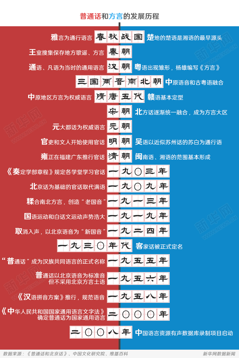 远在春秋战国时期,方言之间的分歧就已经相当明显。《礼记》记载“五方之民,言语不通”。试想,如果儒家一口吴语、法家一口湘语,如何唇枪舌战?为促进交流, 春秋战国时期的 各诸侯国 曾 以“雅言”为通用语言。 从先秦的雅言、两汉的通语、宋明的官话、清末的国语再到如今的普通话,方言不断发展的同时,通用语言的规范也持续进行 。