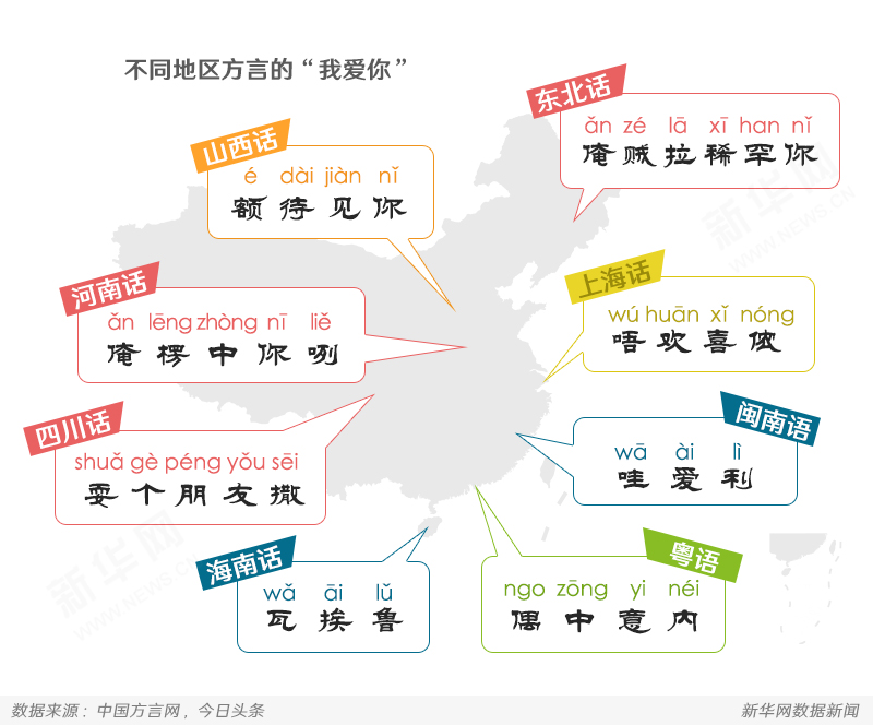 受地理阻隔、人口迁徙等因素影响,各方言间差异众多。即便是同一方言,其内部差异也大于一些欧洲的不同语言。以“我爱你”为例,同一意义在不同地区有着截然不同的表达。