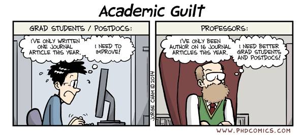 研究生/博士后:“我今年才写了一篇文章,我得多加努力了。” 老板:“我今年才发了16篇文章,我得雇点更好的研究生和博后了。” 图片来源:phdcomics.com
