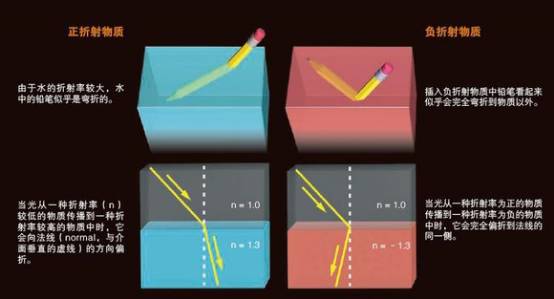 一般情况下,材料的折射率都是正的,例如真空的折射率为1.0,水为1.33,玻璃为1.5左右。1968年,苏联物理学家Victor Veselago从理论上指出,折射率可以为负。