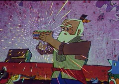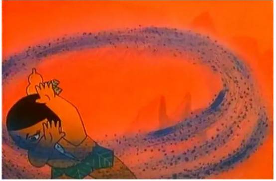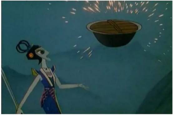 青蛇为了对付四弟火娃,采用激将法对火娃说:“你能将这锅饭煮熟我就缴械投降。”天真的火娃便真的使出了浑身的力气用火去烧浮在空中的这口大锅。