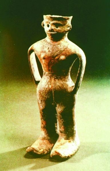 其实这靴子的出现,可以追溯到史前。前面提到陈列在展柜里的陶靴,靴面和靴筒上还有彩绘,属于辛店文化,青海乐都柳湾遗址出土,是史前遗物。在甘肃玉门的火烧沟遗址,还见到一件彩陶双耳罐,陶罐的底部做成穿着靴子的双脚模样,属四坝文化。火烧沟遗址还见到一件陶人像,人像双手掐腰,脚上是一双大靴子,这样夸张地表现靴子,匠心独运。