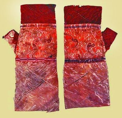 古代还有丝绢菱罗缝制的手套,长沙马王堆汉墓就有出土。墓中随葬的一件九子漆奁里,就装着三副手套。其中一副“朱色菱纹罗手套”,长26.5厘米,直筒露指头形,大拇指套分缝,掌面为朱红色菱纹罗,掌部上下两侧饰“千金绦”,绦上有篆书白文“千金”字样。