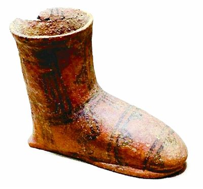 年代更早的发现,还有属于齐家文化的双脚形陶罐。齐家文化、四坝文化和辛店文化的靴子,应当是真正的雪地靴吧。西北寒季较长,风雪也大,靴子的发明与流行也很自然。那年代游牧业发达,羊皮也来得容易,做一双皮毛靴子,不会那么困难。