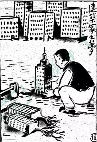 丰子恺发表在《东方杂志》上的漫画《建筑家之梦》。大楼是用树苗种出来的。而现在越来越多的年轻人成为房奴。