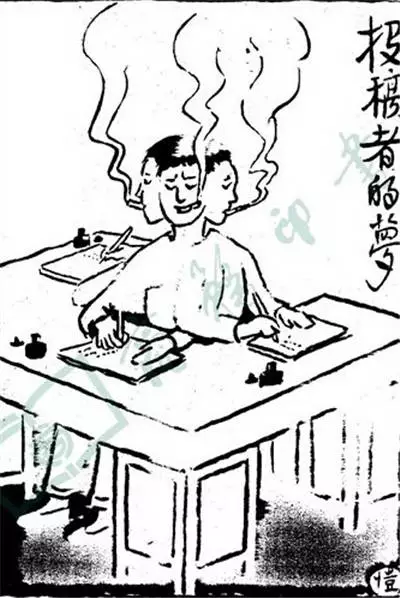 丰子恺发表在《东方杂志》上的漫画《投稿者的梦》。虽然现在的作家们没有生出三头六臂,但我们有了电脑、有了网络,而现实发生的故事也远超作家们的想象。
