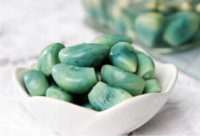 翡翠碧玉腊八蒜。泡腊八蒜是北方,尤其是华北地区的一个习俗。顾名思义,就是在阴历腊月初八的这天来泡制蒜。做法极其简单,将剥了皮的蒜瓣儿放到一个可以密封的罐子、瓶子之类的容器里面,然后倒入醋,封上口放到一个冷的地方。慢慢地,泡在醋中的蒜就会变绿,最后会变得通体碧绿的,如同翡翠碧玉。