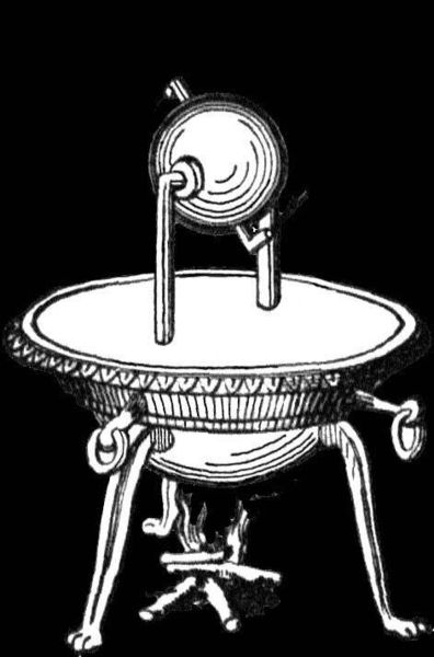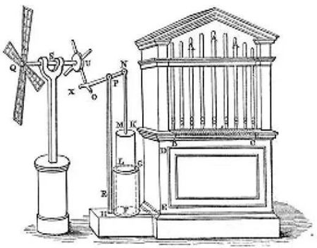 其实希罗的发明远不止这一样。他还发明过自动售货机。他在《机械学与光学》(Mechanics and Optics)中描述了这种机器,它和现代自动售货机类似,只要在机器上方的狭槽里插入硬币,就有一份圣水会自动流出来。