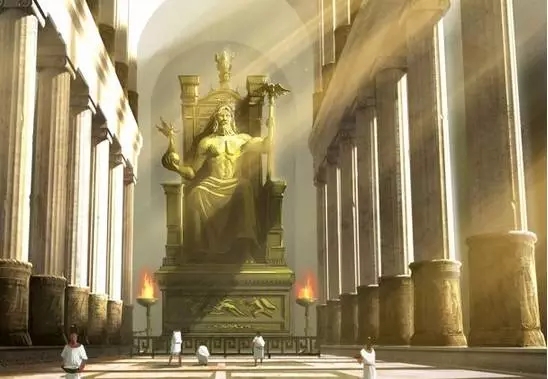 奥林匹亚宙斯神像 奥林匹亚宙斯神像,以木头制成并拼装,外加象牙雕成的肌肉和金质的衣饰,高达40英尺,占据了神殿整个西侧。尽显主神之威严,膜拜者潮涌而来。