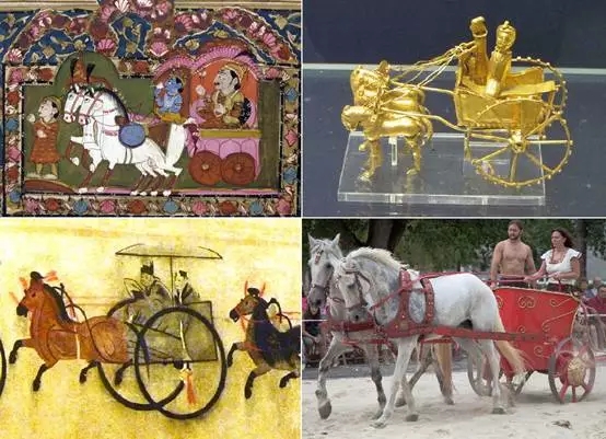 从左上角起,顺时针方像依次为古代印度战车、古代波斯战车、古代欧洲战车和古代中国战车的形象