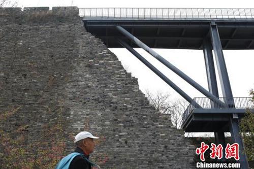 资料图:南京650岁古城墙“植入”了灰色的现代钢结构桥梁。 泱波 摄