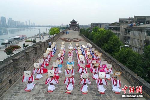 资料图:湖北省襄阳市临汉门古城墙上举办一场盛大的“开笔礼”。周政 摄